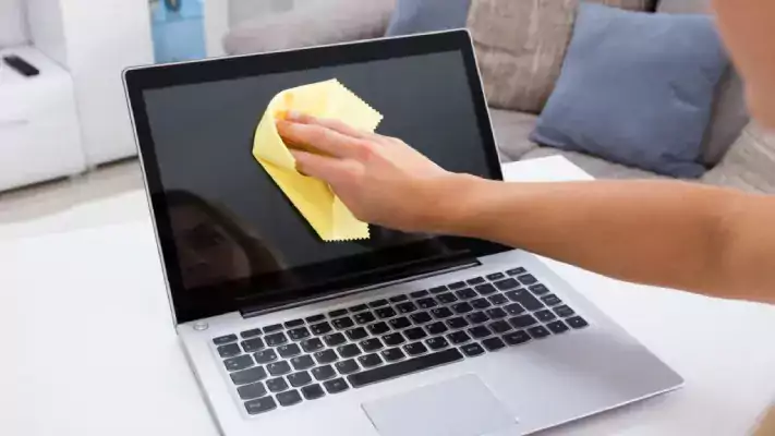- آب های روی لپ تاپ را با یک دستمال نخی پاک کنید تا تمام آب جذب دستمال شود.